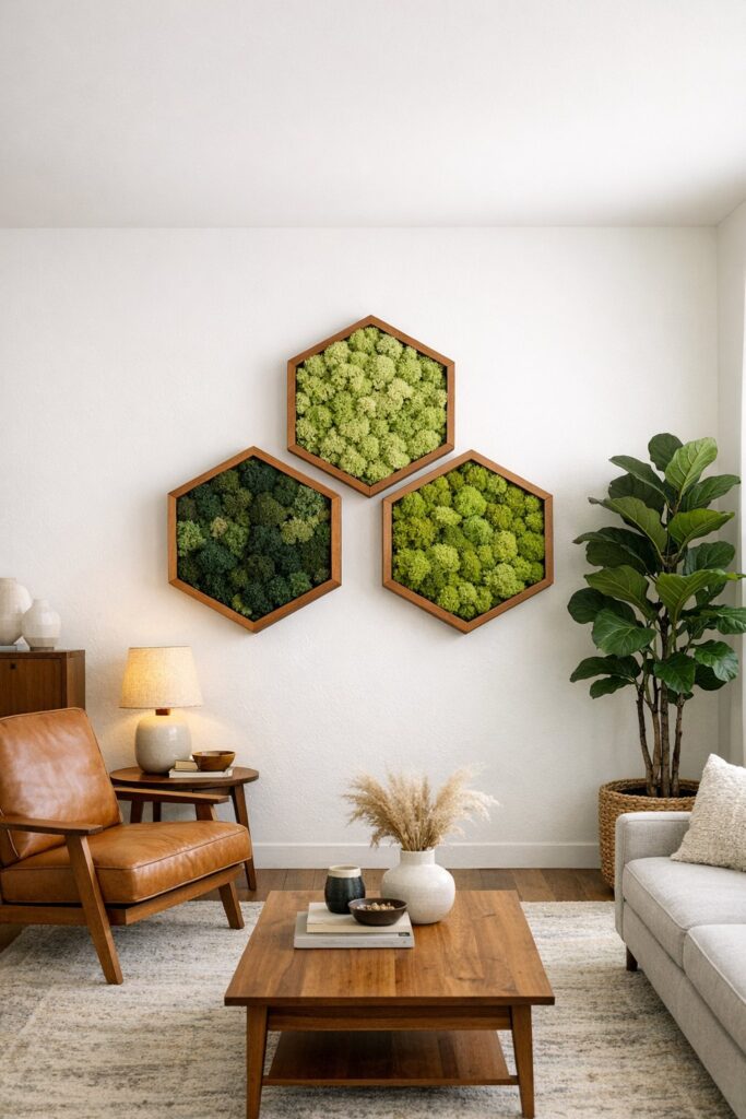 Hexagon frames grouped together instantly look intentional and high-end. Fill each frame with a slightly different moss type and hang them offset for movement and depth. It’s perfect for filling larger wall spaces without committing to one massive piece.