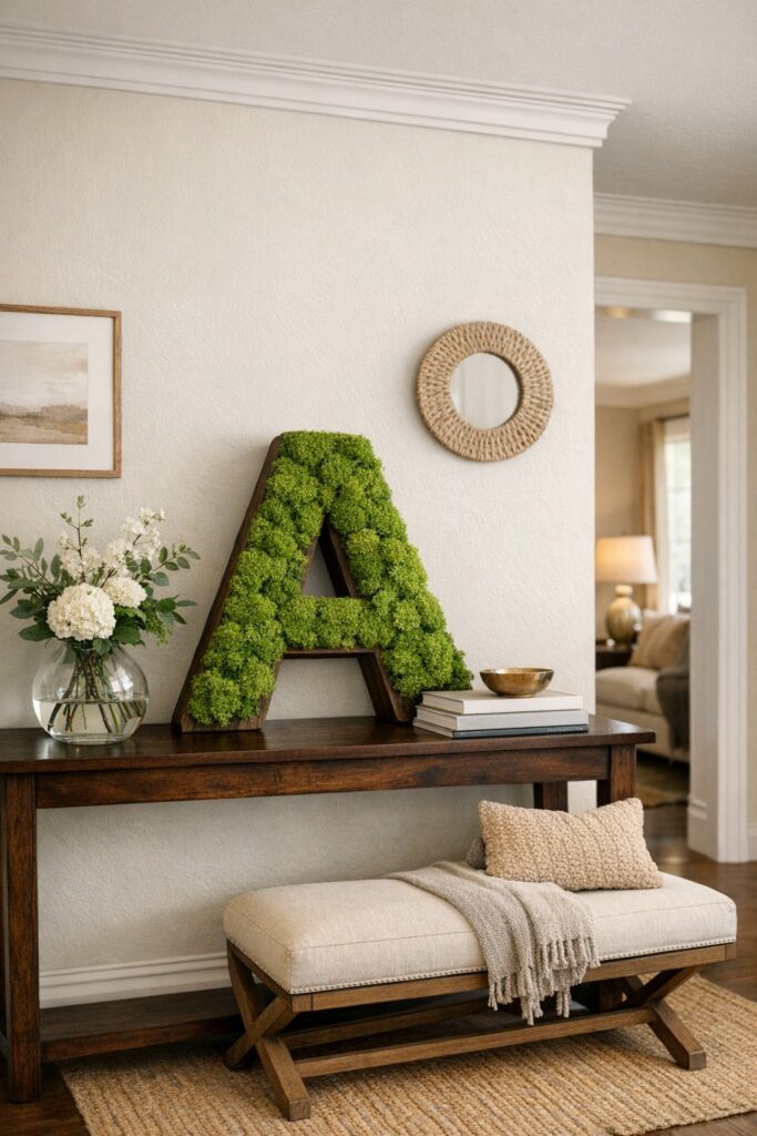 Wooden letters work best—they hold their shape and give clean edges. Apply glue and cover the surface with moss, wrapping slightly around the sides so no base shows through.