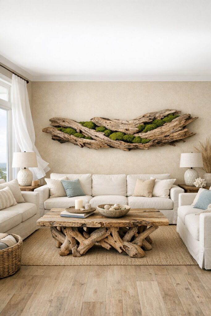 Driftwood makes a stunning base. Glue small tufts of moss into cracks and crevices so it looks like the greenery is naturally growing from the wood. The contrast between weathered wood and soft moss feels organic and refined.