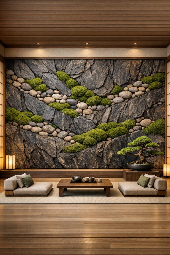 Combine slate tiles or river stones with deep green moss for dramatic contrast. Arrange stones first, then fill gaps with moss for a grounded, Zen-inspired look.