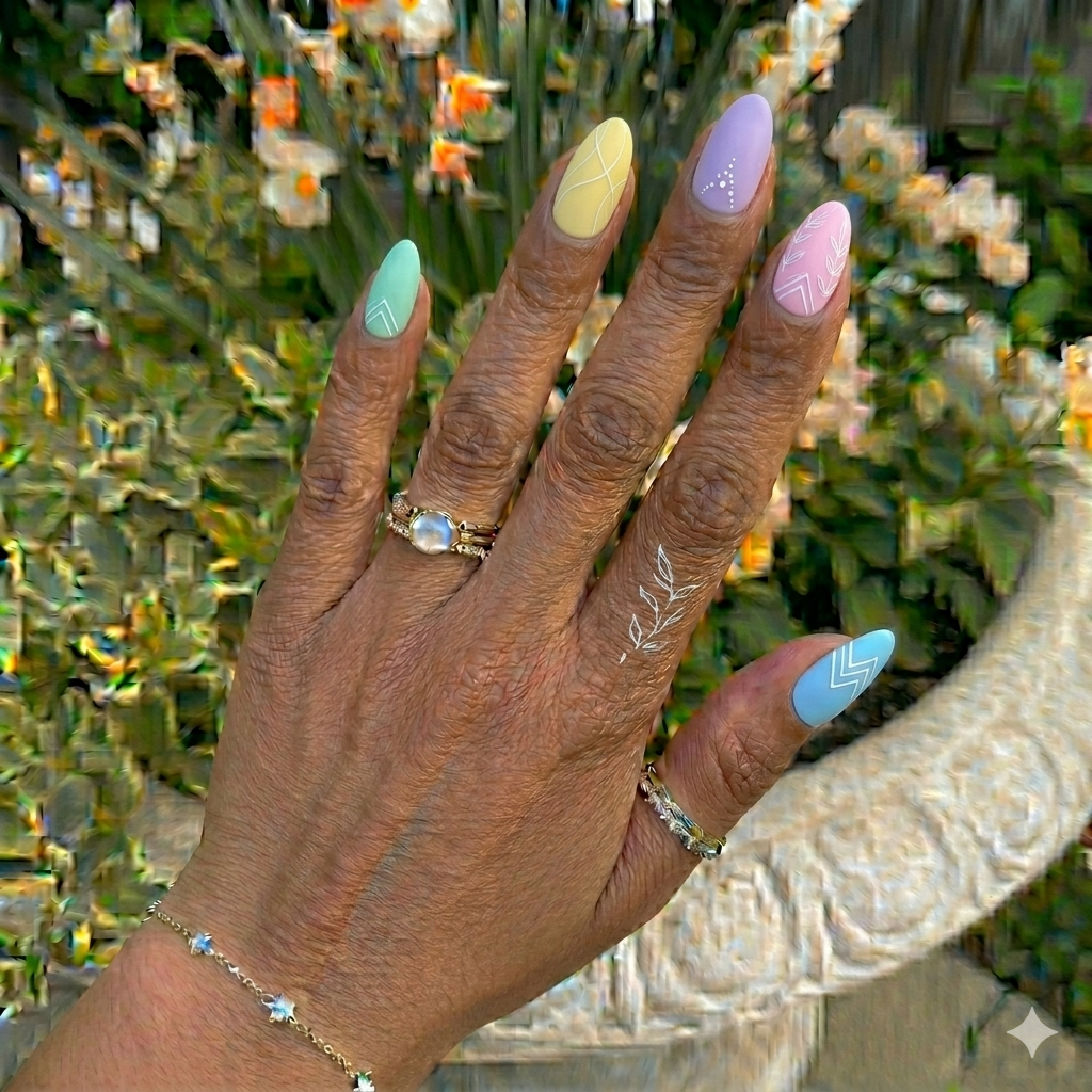 - Colored matte tips (lavender, peach, or mint)