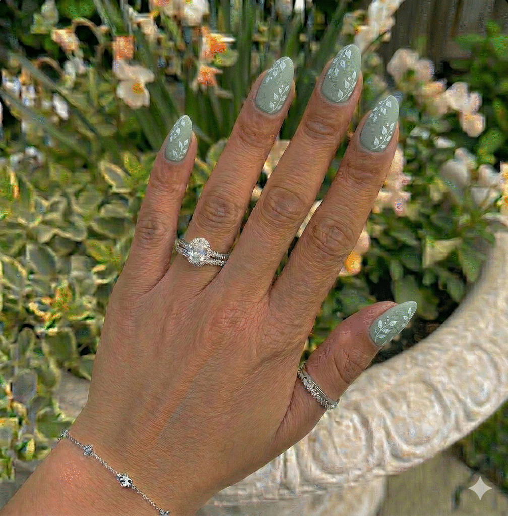 Spring is all about nature. A matte sage or olive base with tiny hand-painted leaves looks fresh and unique.