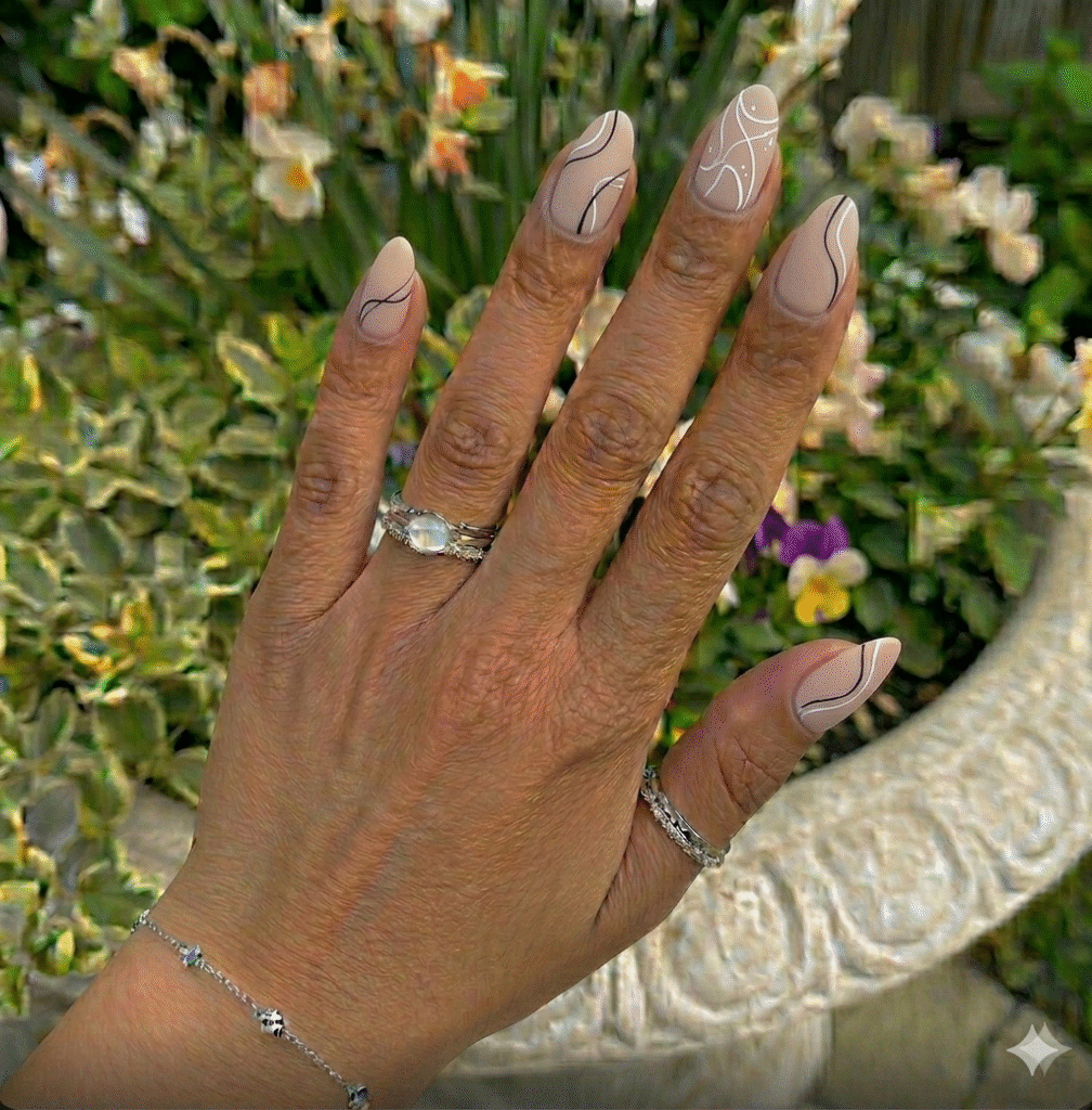 Minimal line art on matte nails looks clean and modern. It’s ideal for work environments or if you prefer understated elegance.