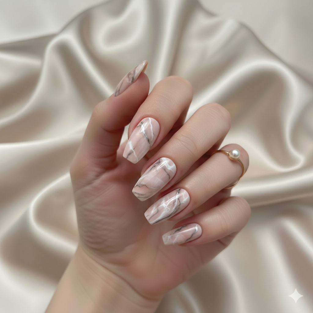 Marble nails in white and nude tones give a luxurious stone-like effect.
