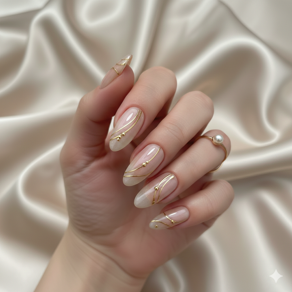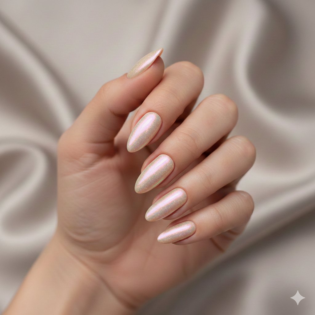 Inspired by the viral glazed nail trend, this look uses a sheer pink or nude base with a pearly chrome powder on top.