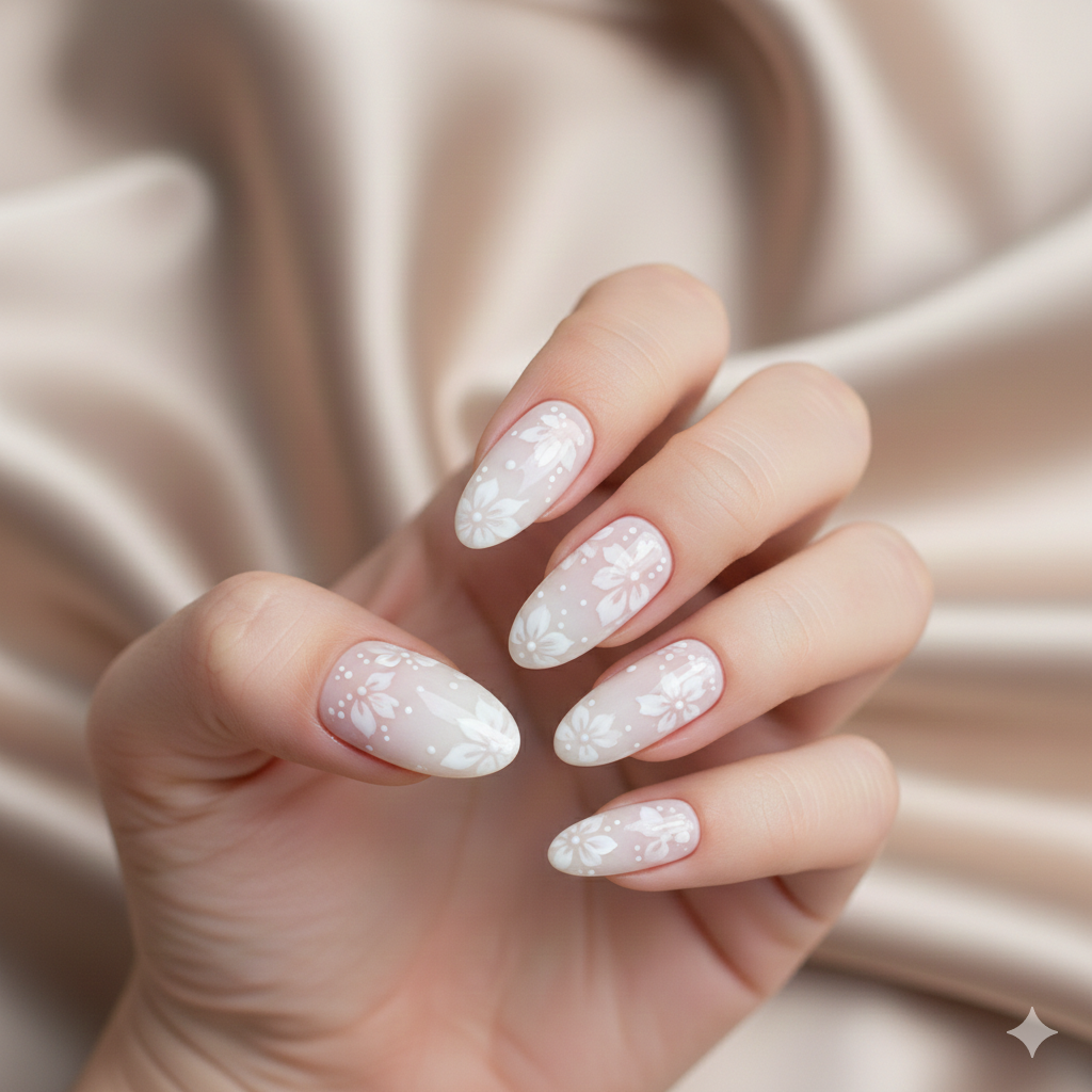 Tiny white or nude floral art over a transparent or milky base feels feminine and light.