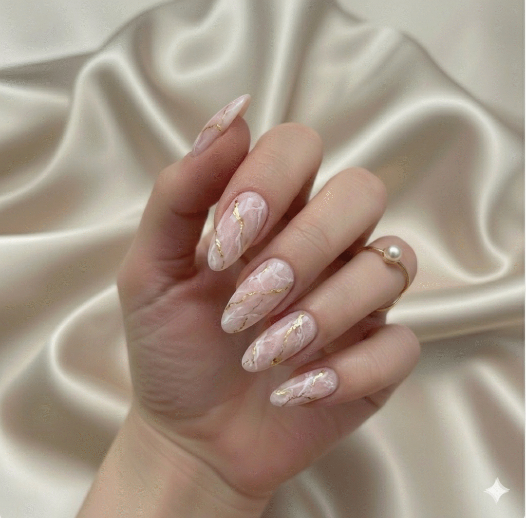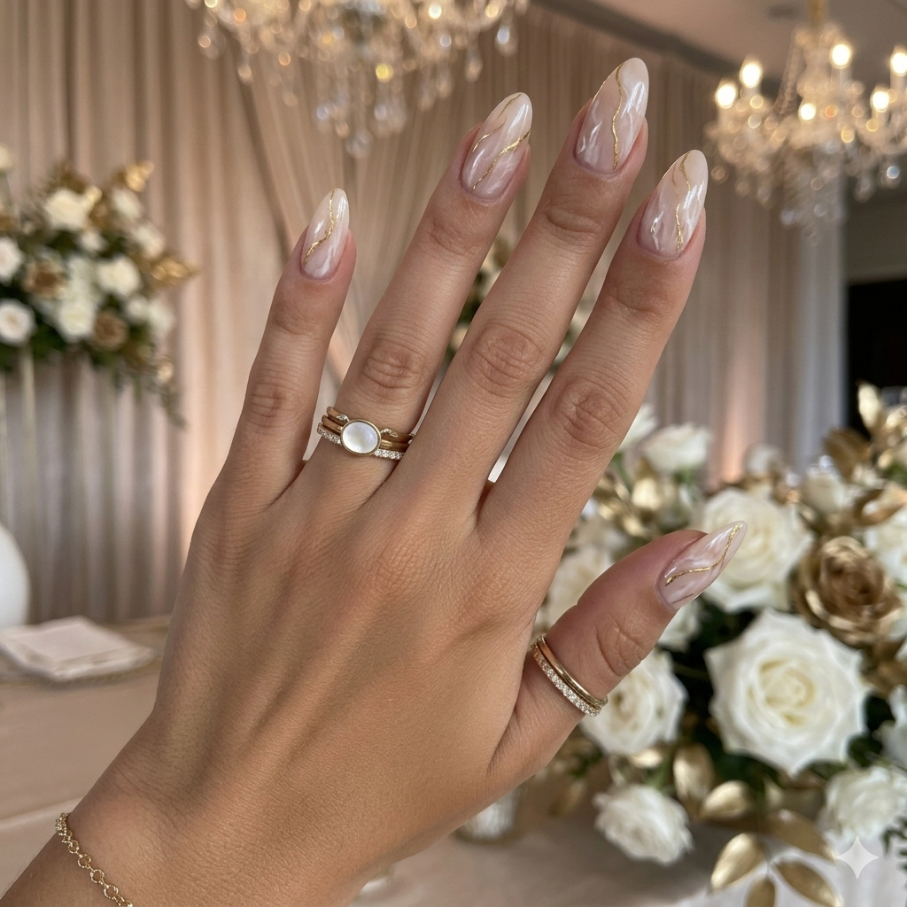 A sheer nude base with subtle white marble and thin gold foil lines looks elegant and expensive.