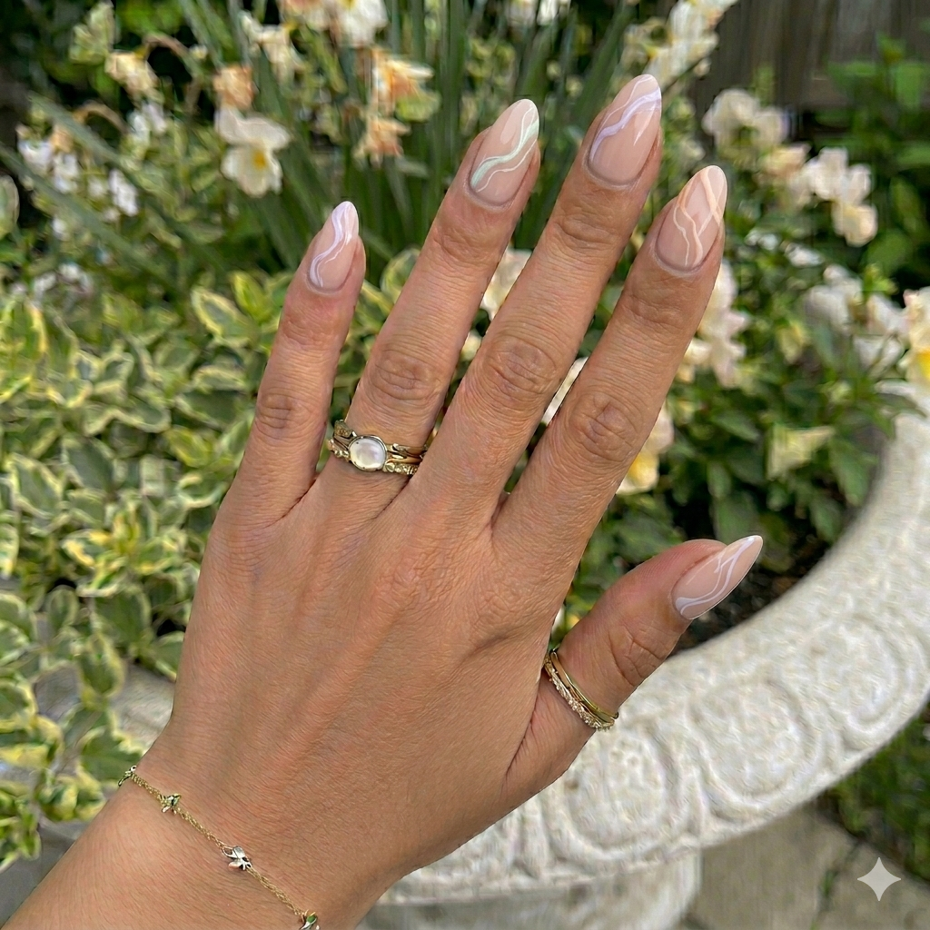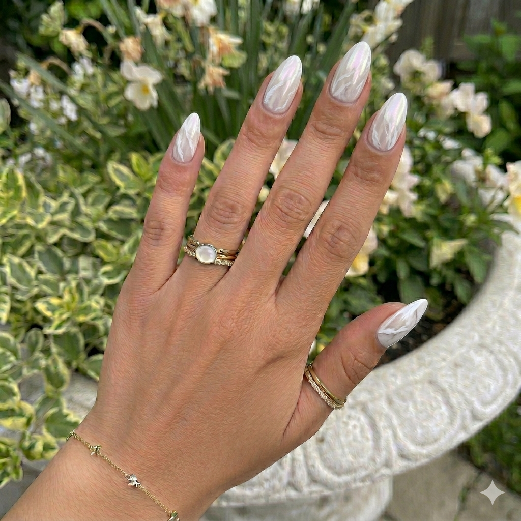 A light blush base with milky white swirls creates a clean, feminine look.