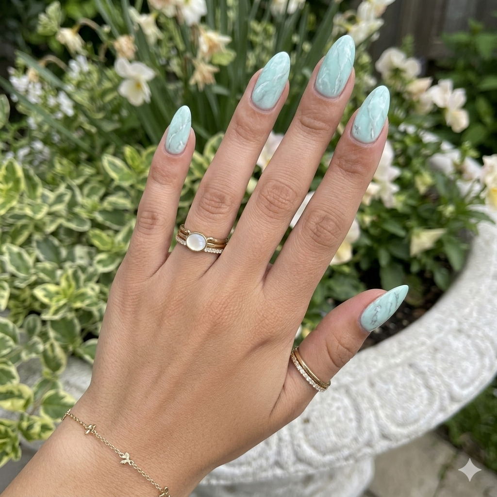 Mint with soft white veining feels fresh and playful without being loud.