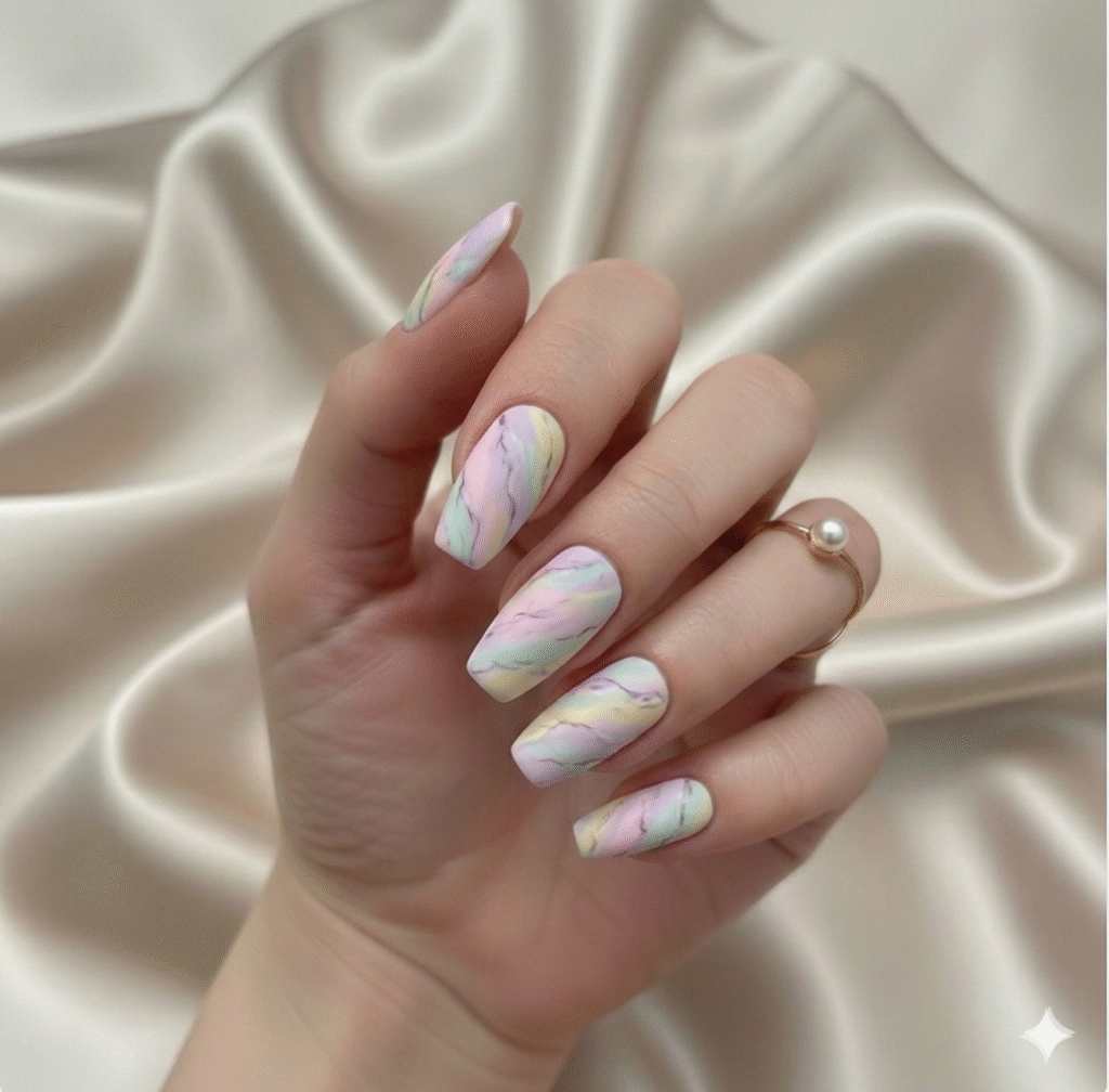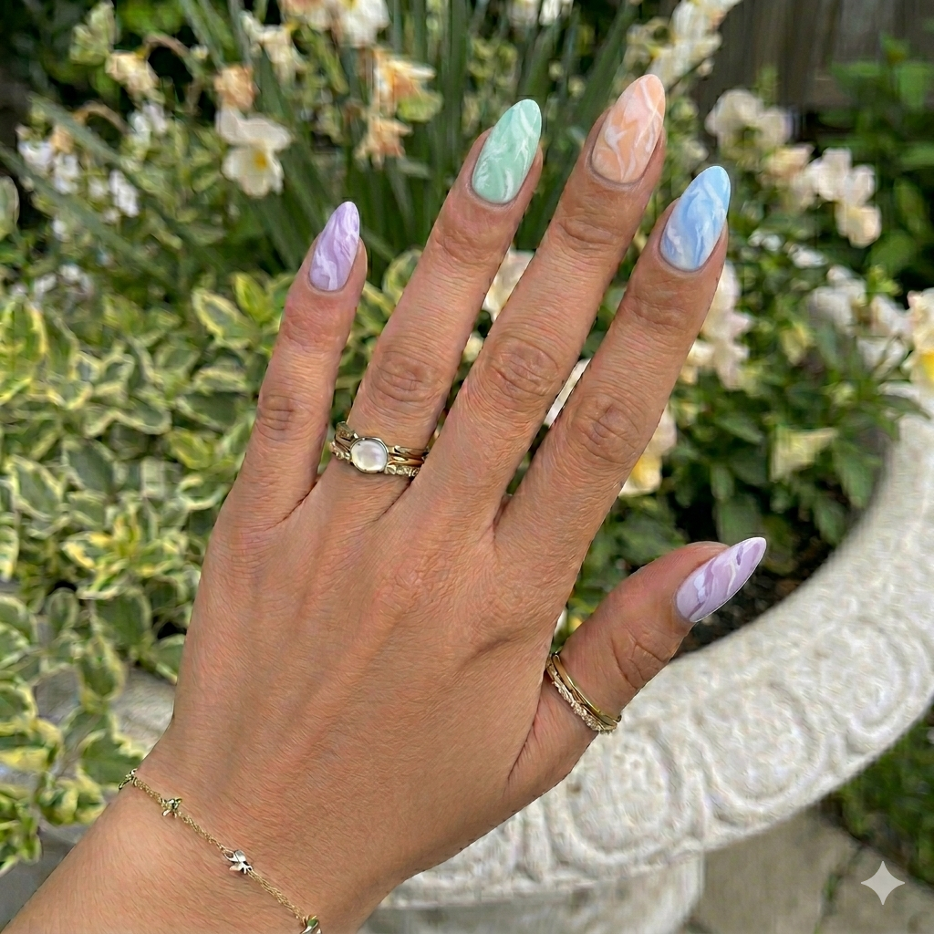 Each nail uses a different pastel marble (lavender, mint, peach, blue) while keeping the same swirl style for cohesion.
