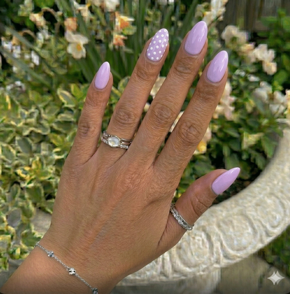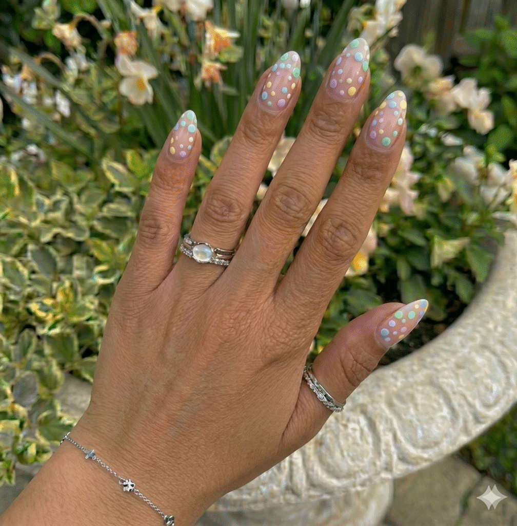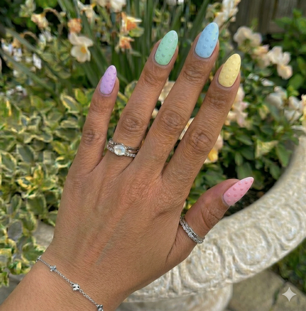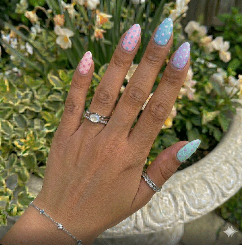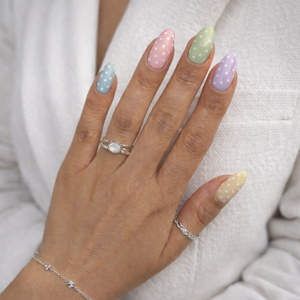 Imagine each nail painted in a different pastel shade — baby pink, mint green, lavender, soft yellow, sky blue — topped with tiny white polka dots. The result? Light, happy, and totally spring-ready.