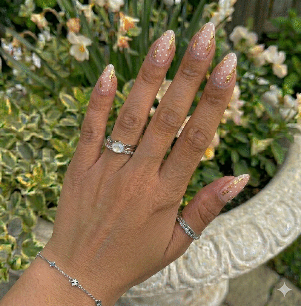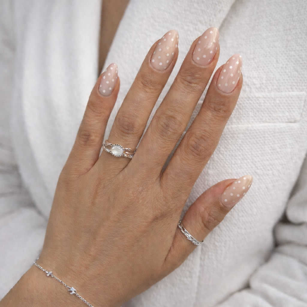 A sheer nude or milky base with tiny white dots scattered delicately across the nail gives a clean, fresh look. It feels effortless and chic — perfect for work, university, or brunch dates.