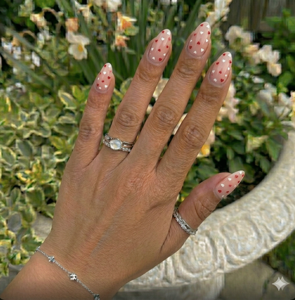On a pastel base, small red or white hearts placed randomly across the nail create a cute, romantic feel — perfect for spring dates.