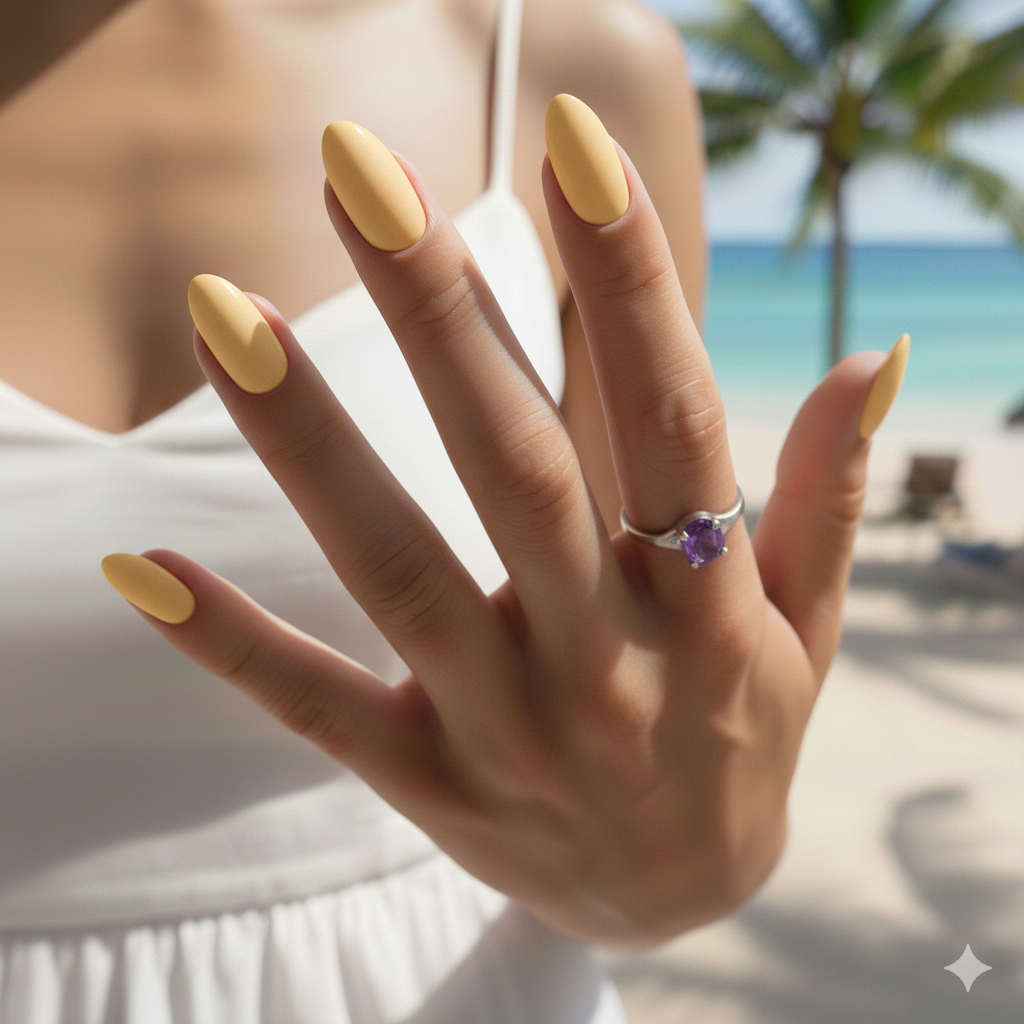 Butter yellow is trending everywhere right now. It’s warm, cheerful, and feels like sunshine on your fingertips.