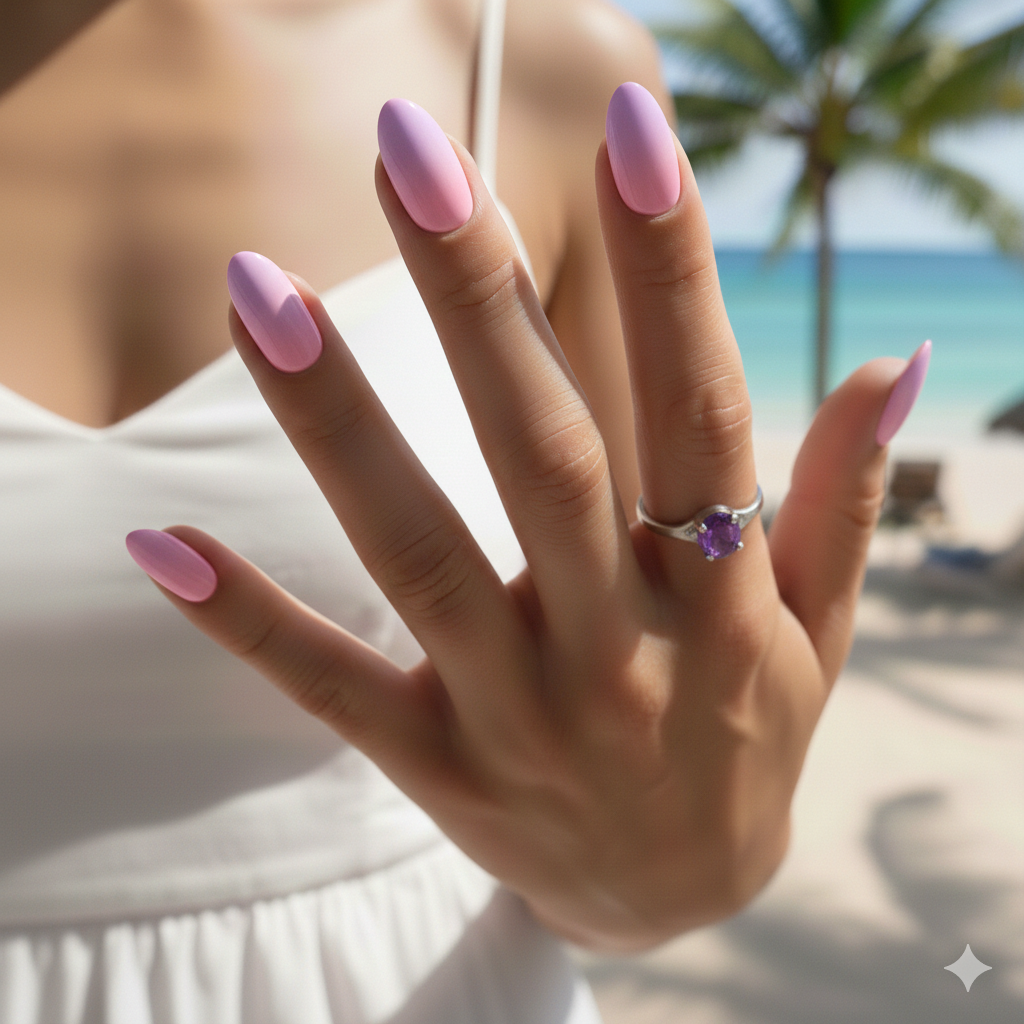 Lavender pastel nails feel calm, romantic, and slightly whimsical. They look beautiful against tan skin and pair perfectly with silver rings.