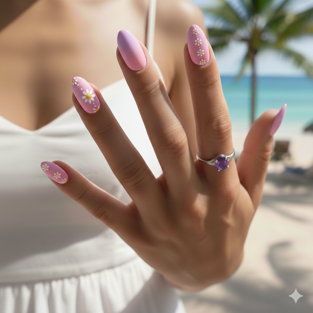 Add tiny white daisies over a pastel base like mint, lavender, or baby pink. This gives sweet, Instagram-ready energy.