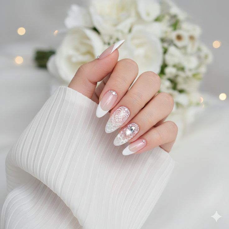 Pure, pristine, and utterly bridal — this design features a crisp white French tip with subtle lace-like detailing or pearl accents at the base. It’s the kind of nail that looks like it belongs on a bride walking down the aisle on Valentine’s Day. Use a fine nail art brush to create delicate lace patterns, or press on tiny pearl gems for an effortlessly luxe finish.