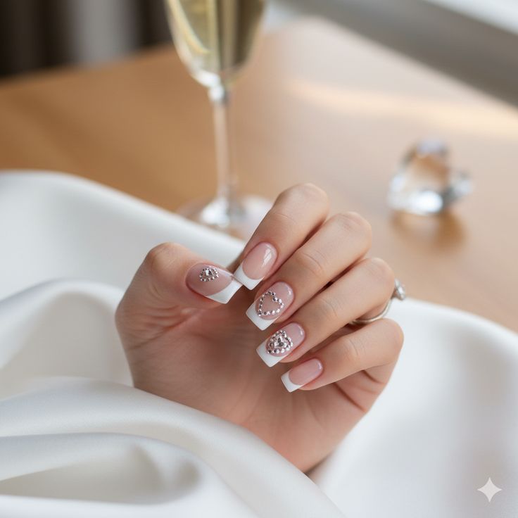 Rhinestones and crystals meet the white French tip in this glamorous Valentine design. Crystal Heart Dreams Nails feature a clean white tip with a cluster of crystal AB or red rhinestones placed in a heart formation near the cuticle or along the tip line. The gems catch the light beautifully and make your nails look like a piece of fine jewelry. Secure gems with nail glue and finish with a generous layer of topcoat.