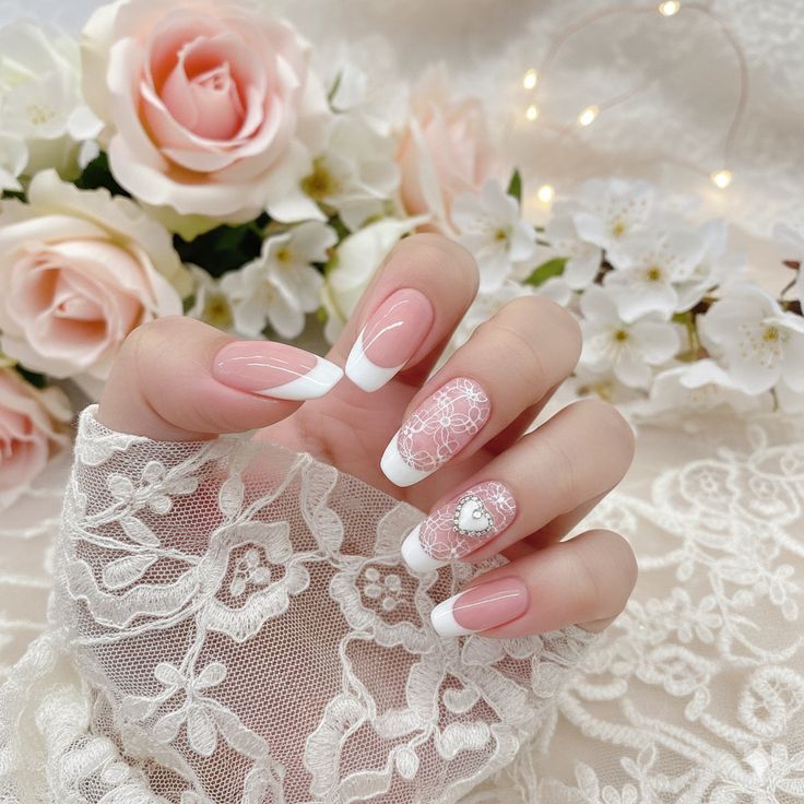 Lace nail art is one of the most intricate and beautiful techniques in the nail world — and Love & Lace Nails make it feel effortlessly Valentine. A white French tip serves as the lace border itself, with delicate lace-like patterns hand-painted or stamped across the nail bed in white or ivory. It looks bridal, editorial, and utterly romantic. Pair with a sheer pink base for the most dreamy effect.