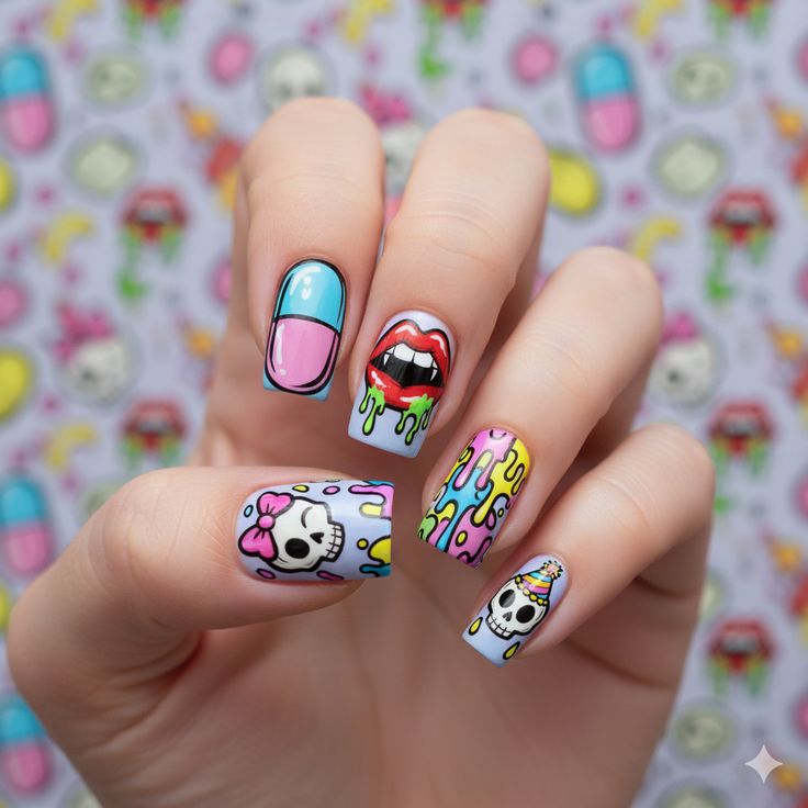 How to achieve it: Paint a bright base colour on each nail. Use a medium brush to paint bold lip shapes in red, then outline in thick black. Add halftone dot patterns using a dotting tool dipped in a slightly darker shade of the base colour. Add comic text with a fine nail art pen.