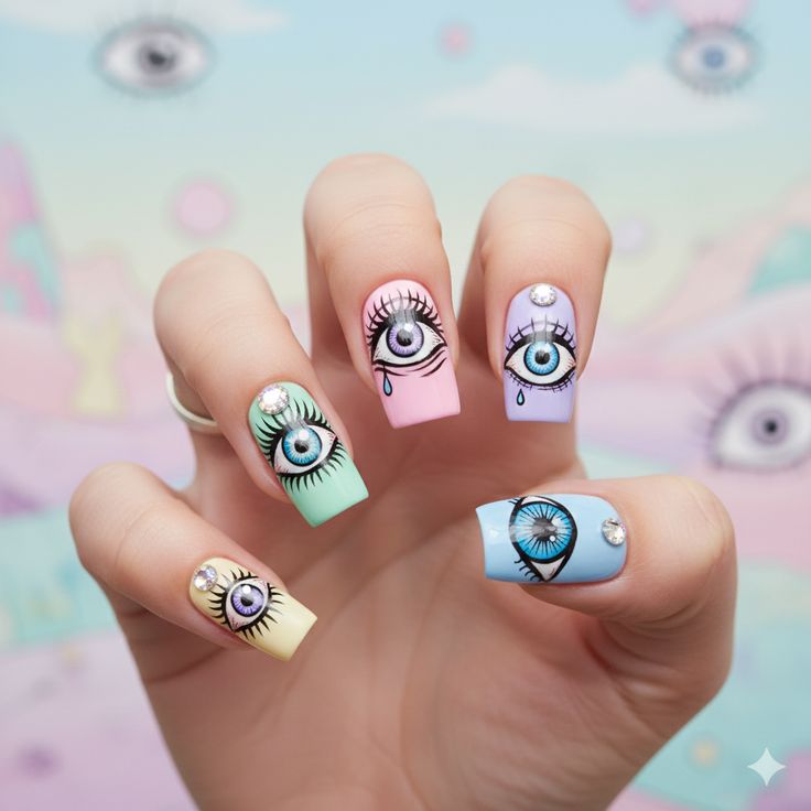 Surreal, hypnotic, and utterly original — All Eyes on You Nails feature the pop art eye motif made famous by artists like Mel Ramos and the trippy psychedelic poster art of the 1960s. Bold, graphic eyes in every style — cartoon eyes with thick black lashes, wide-open Lichtenstein-style eyes with halftone dot shading, abstract all-seeing eyes with rainbow irises — cover every nail in a design that feels both whimsical and slightly surreal. These are the nails for the person who genuinely wants people to look twice.