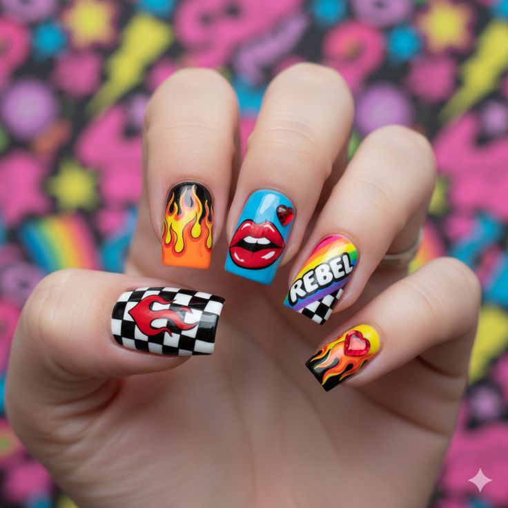 Bright primary colours, graphic black outlines, cartoon lips and eyes, checkered patterns, starburst comic effects, retro typography, psychedelic swirls — pop art nails throw every rule out the window and replace them with one guiding principle: more is more. These are nails that scream personality, creativity, and an absolute refusal to be boring.