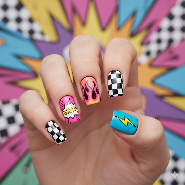 Classic checkerboard pattern gets a full pop art upgrade — Checker Pop Nails combine the timeless black and white checker with vivid pops of colour and graphic pop art elements to create a design that feels simultaneously retro and modern. Some nails feature the full checker pattern in black and white or in coloured variations, while others use the checker as a background element behind cartoon mouths, starburst explosions, or bold graphic text. The checker adds geometric structure that grounds the otherwise maximalist pop art elements.