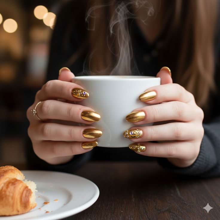 This is the design that proves Minion nails can be genuinely glamorous. Golden Minion Glam uses rich gold chrome and metallic tones as the primary nail finish — sophisticated, high-fashion, luxurious — with small but perfectly placed Minion goggle or face details as the accent. The result feels more like a designer statement nail than a cartoon, while still delivering that unmistakable Minion wink. Absolutely stunning.