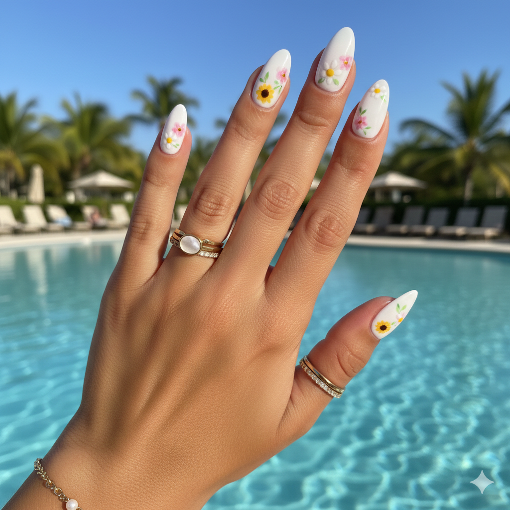 Tiny summer flowers on almond nails feel romantic and soft.