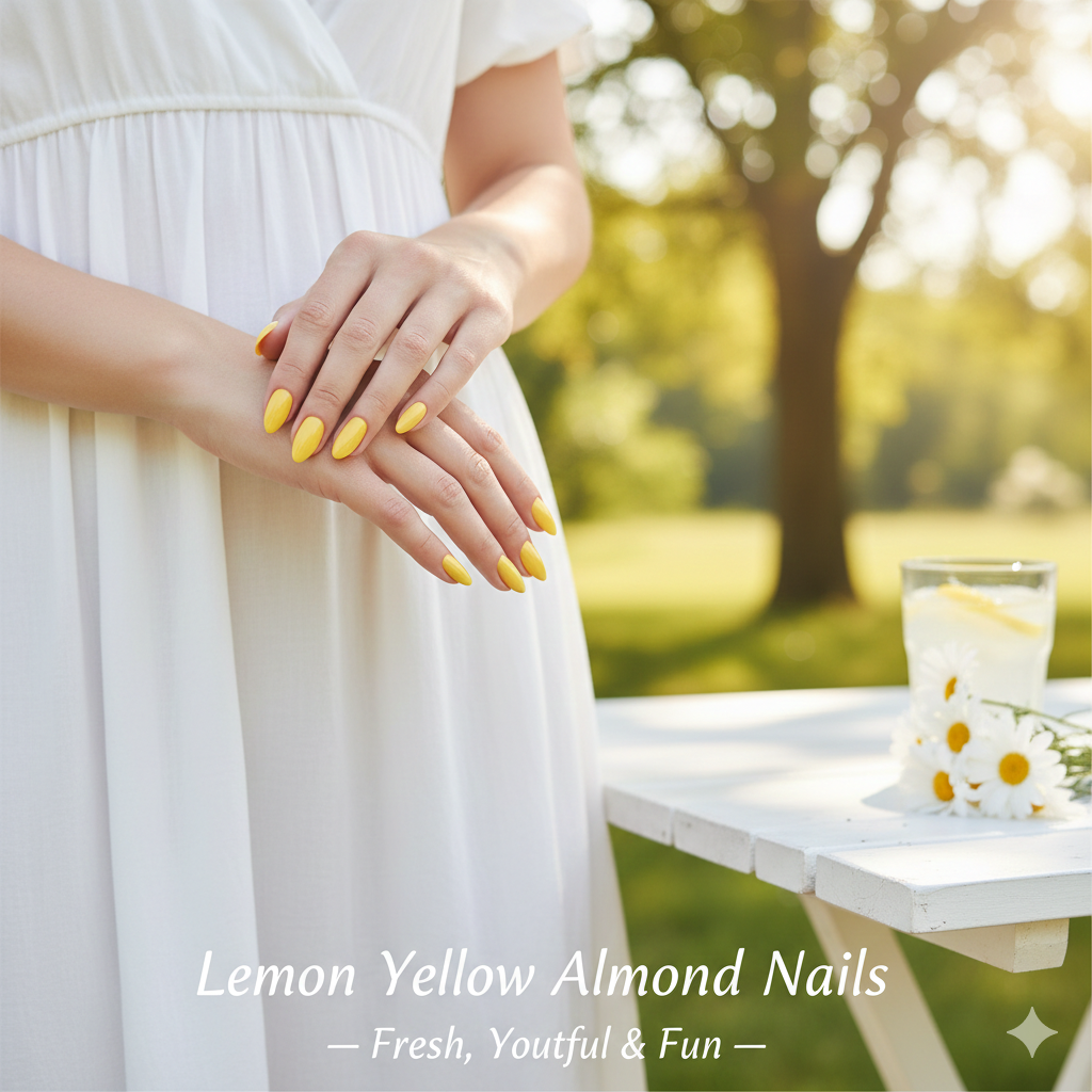 Lemon yellow almond nails look: