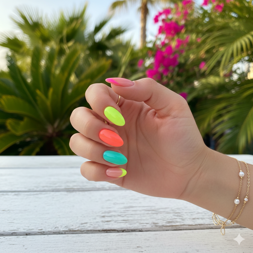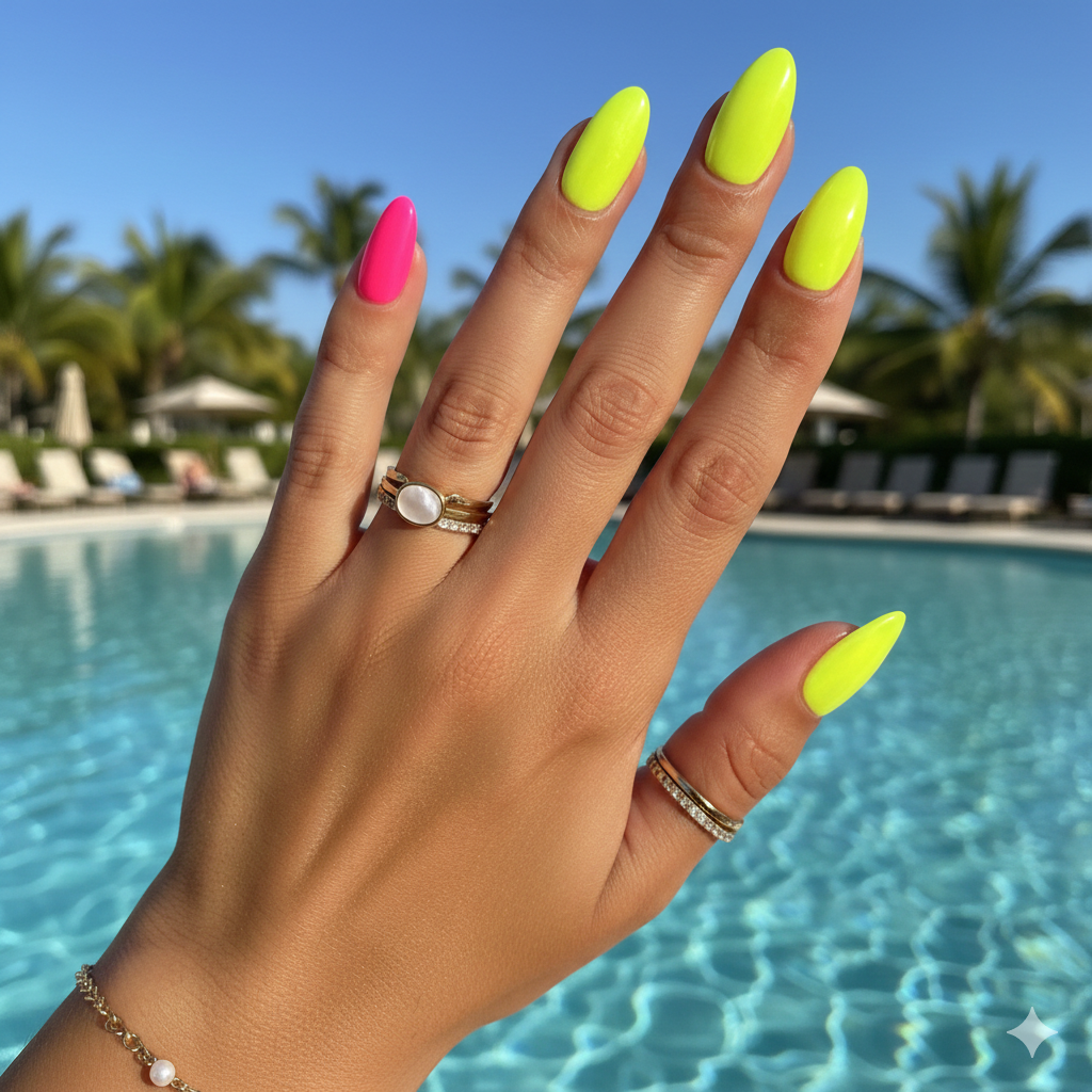 Neon almond nails look amazing at pool parties and beach trips.
