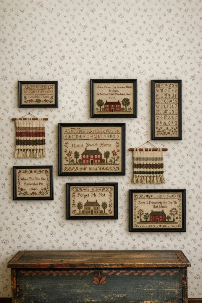 Hand-stitched samplers add patience, care, and meaning to your walls. Their messages—about home, gratitude, and family—set a gentle tone.