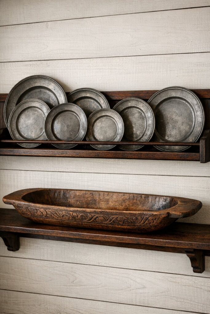 12. Pewter Plates on Wooden Shelves