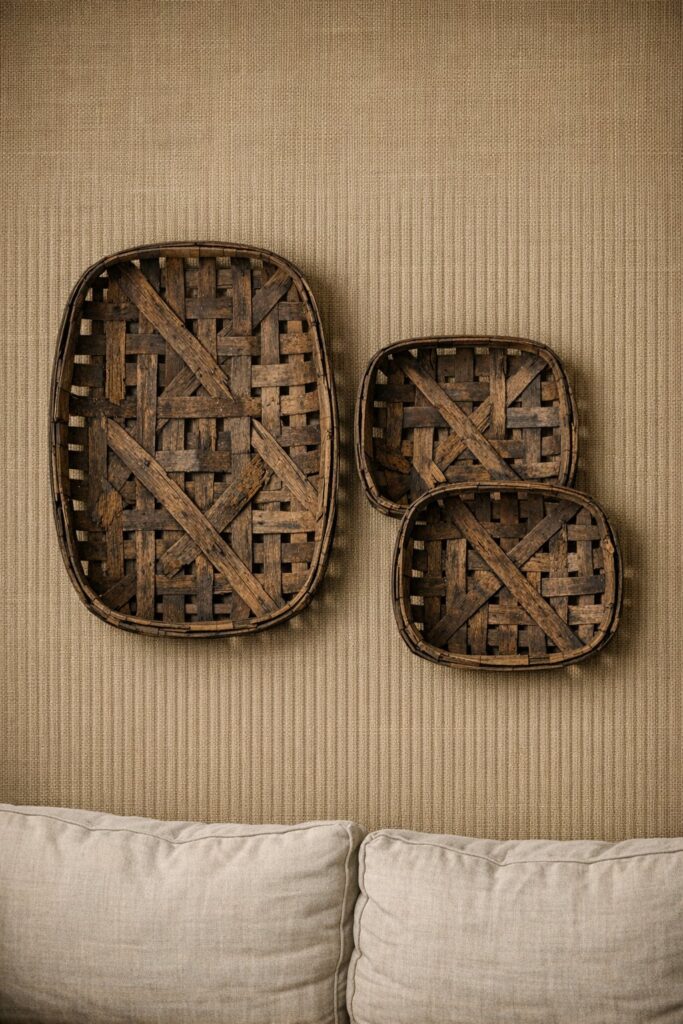 Few things add texture like tobacco baskets. Their woven wood casts natural shadows and gives flat walls real dimension. Look for baskets with wear—that’s where the charm lives. They’re neutral enough to work anywhere but still make a statement.