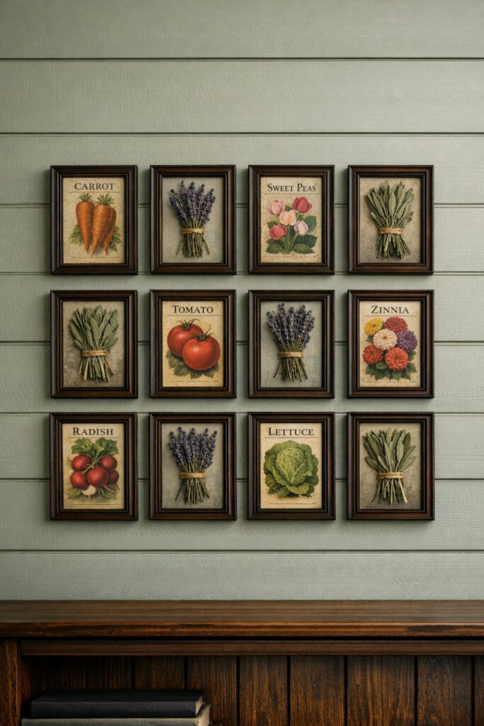 Vintage seed packets come with soft, timeworn colors that suit primitive spaces beautifully. Pair them with bundles of dried herbs for a display that feels alive—visually and aromatically.