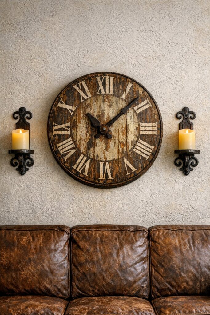 A large, old-world-style clock instantly anchors a gallery wall. Roman numerals, distressed edges, and a slightly imperfect finish make it feel like a cherished heirloom rather than a modern gadget.