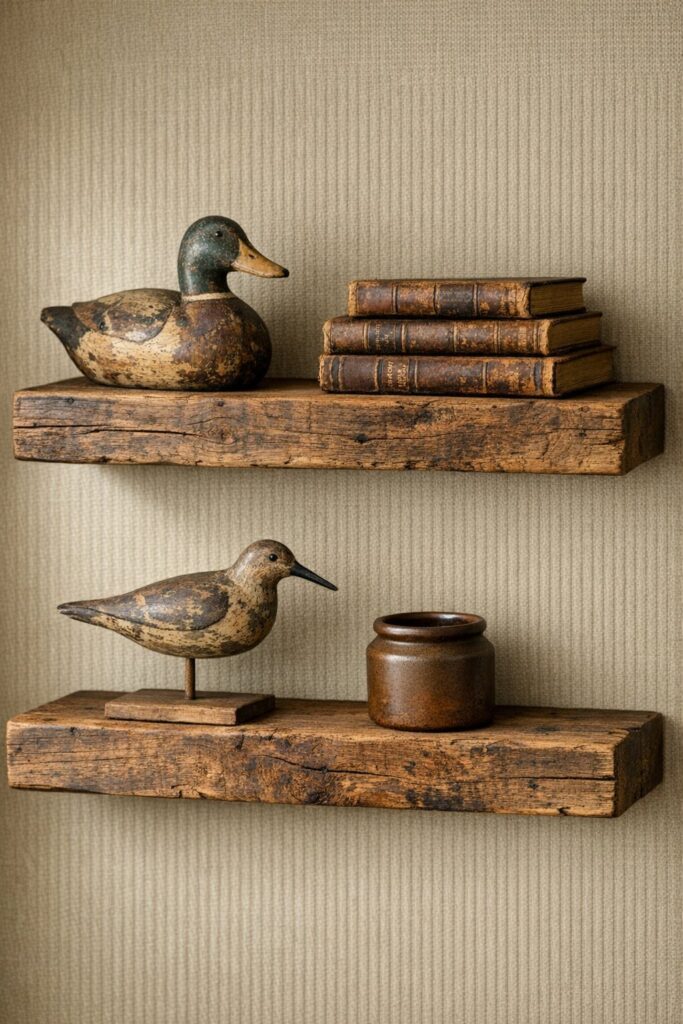 Wooden decoys bring an outdoorsy, handcrafted presence that feels timeless. Displaying them on thick reclaimed shelves gives them breathing room and keeps surfaces clutter-free.