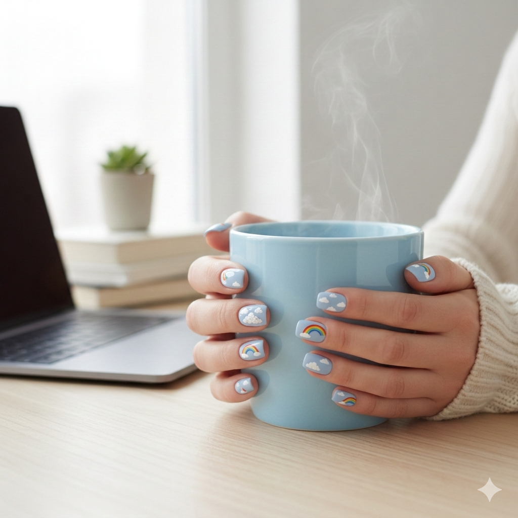 Think soft blue base, tiny white clouds, and mini rainbows.