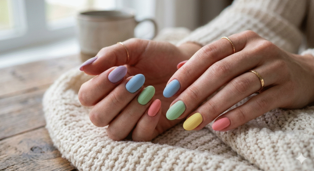 This look blends multiple pastel shades together on each nail, creating a dreamy watercolor effect.