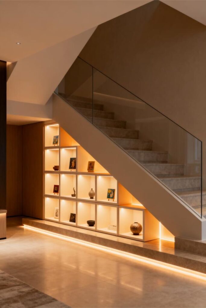 Lighted display cubes turn an under-stairs wall into a mini art gallery.