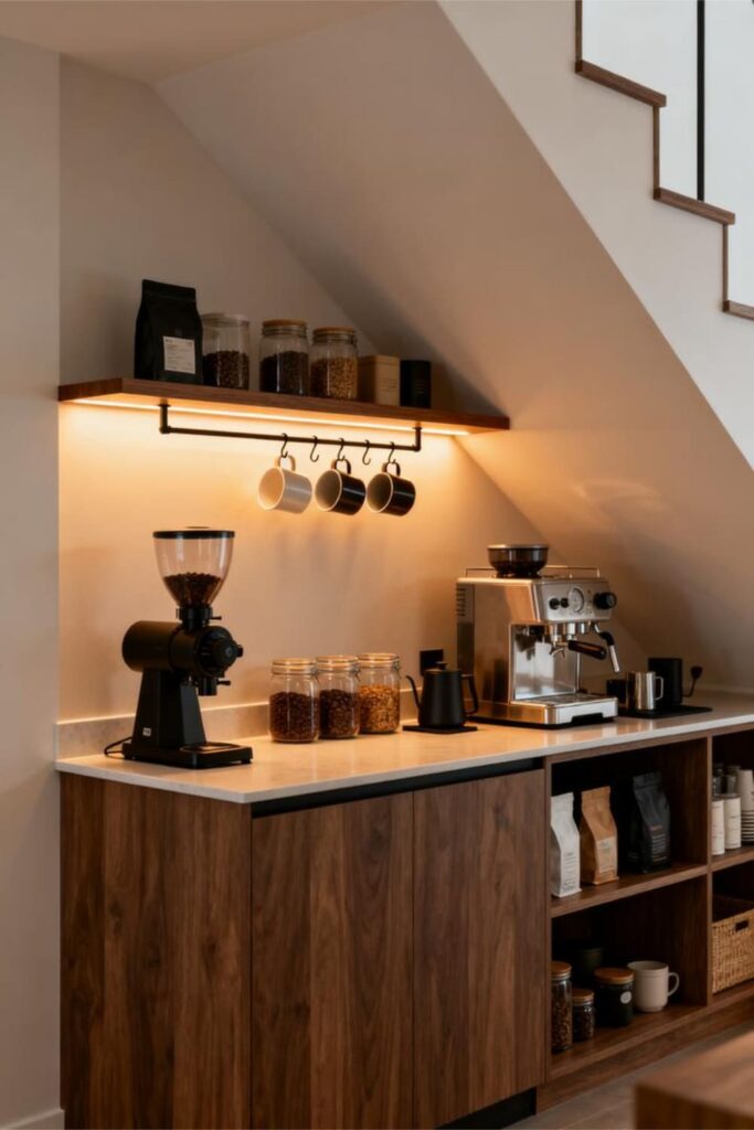Yes—you can put a coffee bar under the stairs, and yes—it will become everyone’s favorite spot.